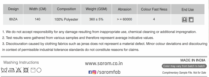IBIZA Fabric offers exceptional durability with a robust 100% polyester composition and a high abrasion resistance of over 60,000 cycles, making it ideal for upholstery and cushions. Measuring 140 cm in width and weighing 360 GSM, it provides a substantial feel while maintaining color fastness rated at 4 for lasting vibrancy. Designed for easy care, this fabric requires dry cleaning and light ironing only, ensuring it retains its quality without hassle. Perfect for heavy-use furniture, IBIZA combines resilience with refined texture to enhance your living space.